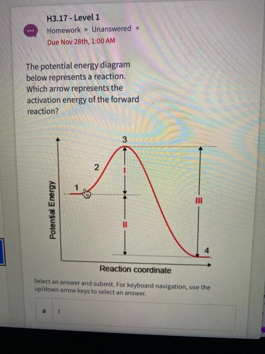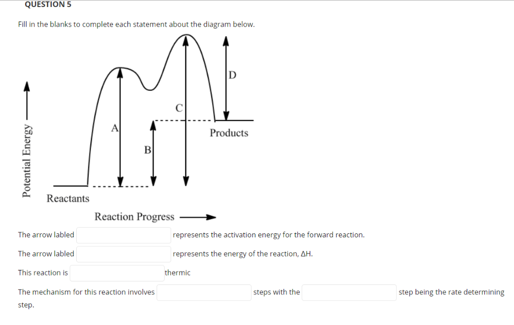 The activation energy is shown as a hump in the line which. E 022 100points Consider the following potential energy dia-gram. Reaction Coordinate Which arrow represents the potential energ of the reactants.